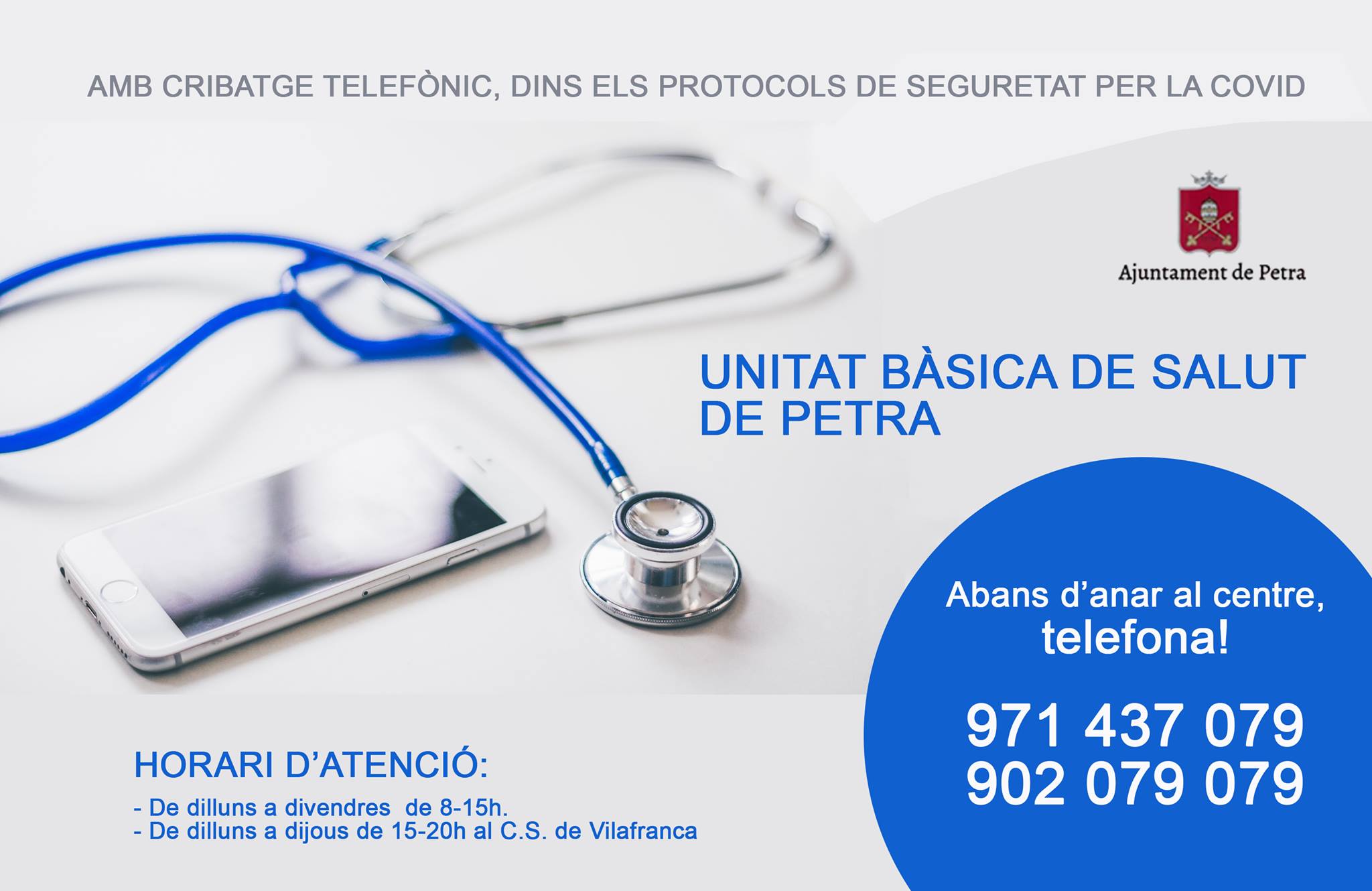 L'horari d'atenció a la Unitat Bàsica de Petra serà de dilluns a divendres de 8h. a 15h. i de dilluns a dijous de 15h. a 20h. al C.S. de Vilafranca.
